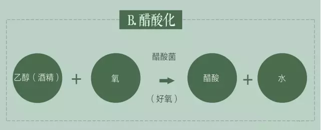 此时的醋酸菌不需培植,而是仰赖原来就存在于空气中的醋酸菌。乙醇氧化为醋酸是放热的过程,氧气在液体中溶解量低,所以提供氧气量的多寡决定了醋酸的产量。也因此,发展出各家酿造时增加供氧量的诀窍办法,例如用搅拌、曝淋或直接输入氧气,好空气的重要性便在此处彰显!